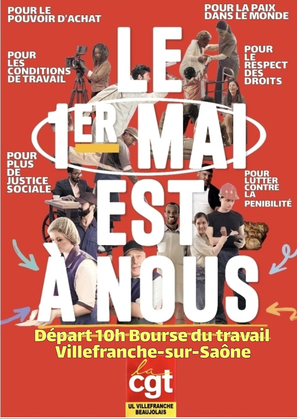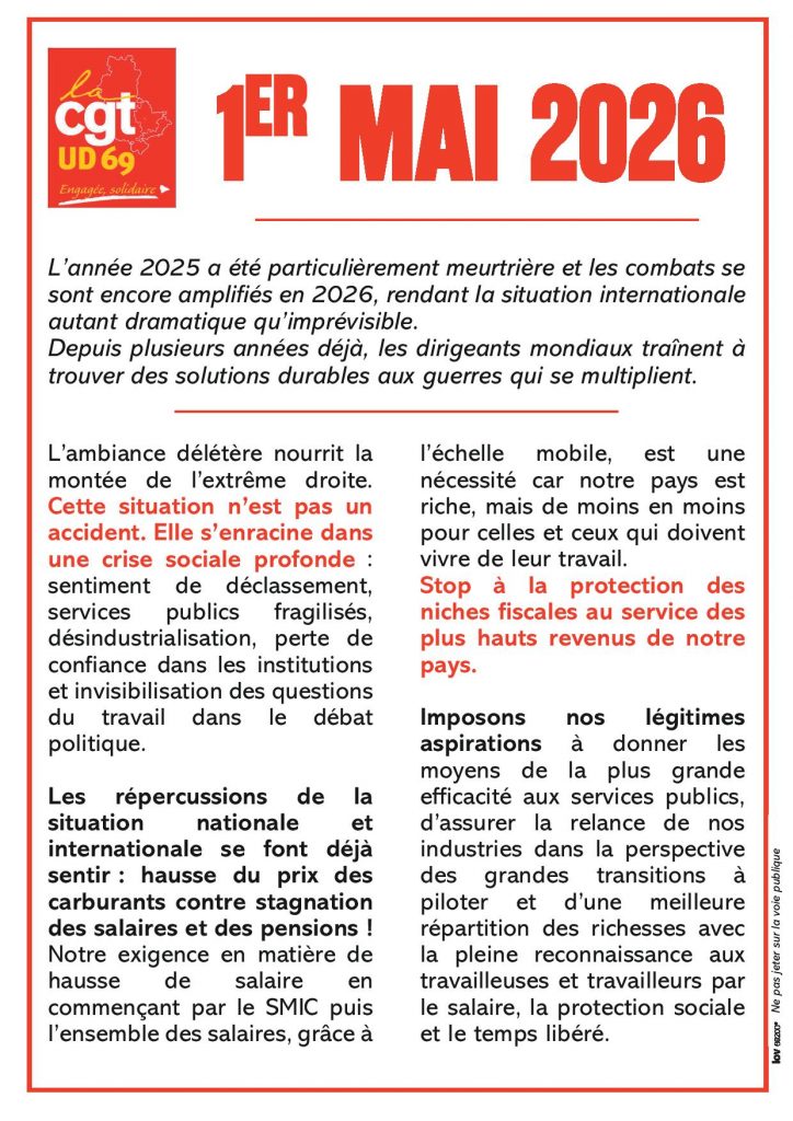 01 Mai 2026 Manifestation à partir de 10h00 Bourse du Travail Manifestation à partir de 10h00 Bourse du Travail « Le 1er mai est à nous! » TRACT – MANIF 1ER MAI 2026 TRACT – MANIF 1ER MAI 2026