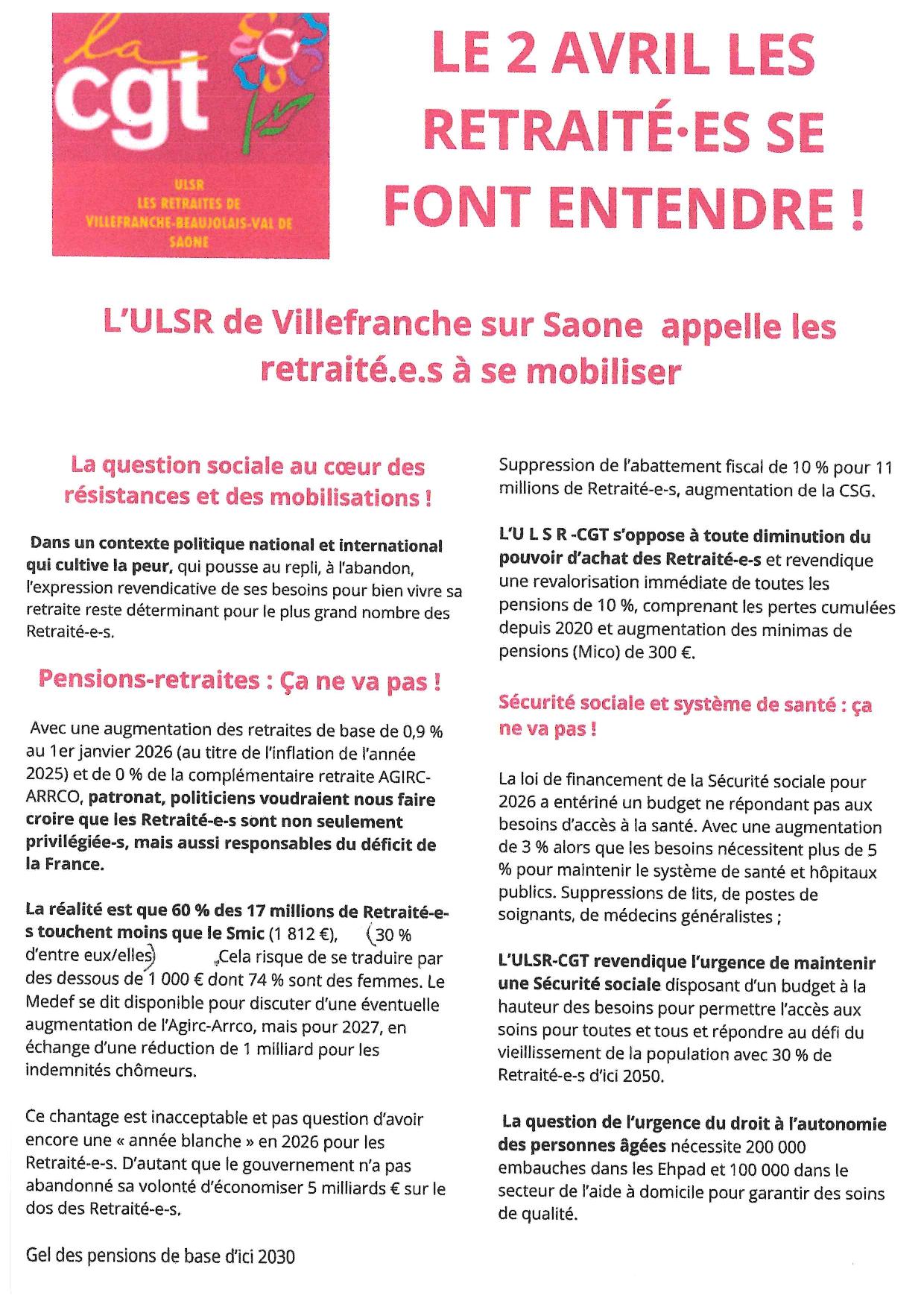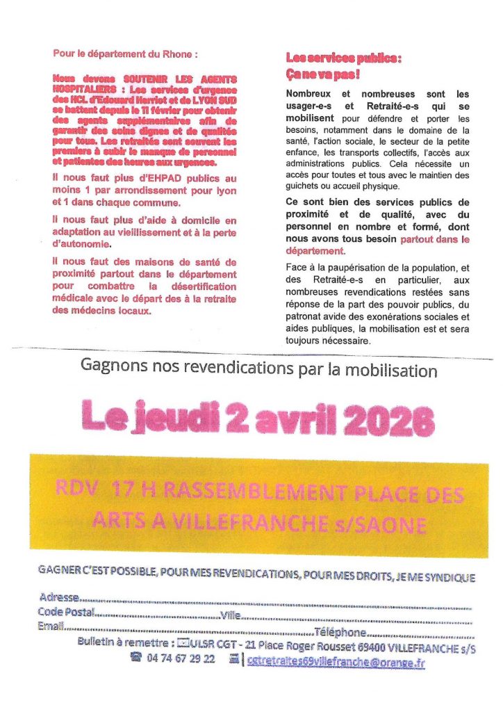 02 Avril 2026 L’ULSR de Villefranche sur Saône appelle les retraité.e.s à se mobiliser 02 Avril 2026 L’ULSR de Villefranche sur Saône appelle les retraité.e.s et toutes et tous à se mobiliser 17H00 Place des Arts Les retraité.es se font entendre 2 Avril 17H place des Arts Les retraité.es se font entendre 2 Avril 17H place des Arts Catégorie : Non classé